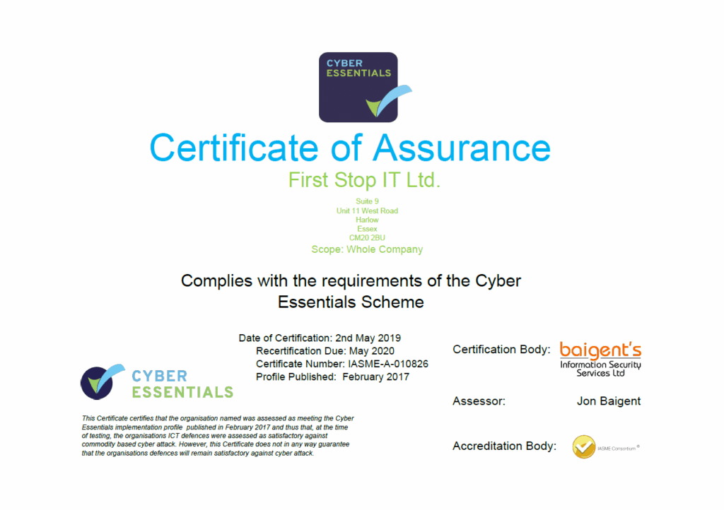 At First Stop IT, we take cyber security very seriously indeed, as any good IT company should, and we are pleased to announce that we have been recertified as Cyber Essentials & IASME Assessors for the third consecutive year! This means our systems and processes are deemed compliant, and we can help you make sure that yours are too.